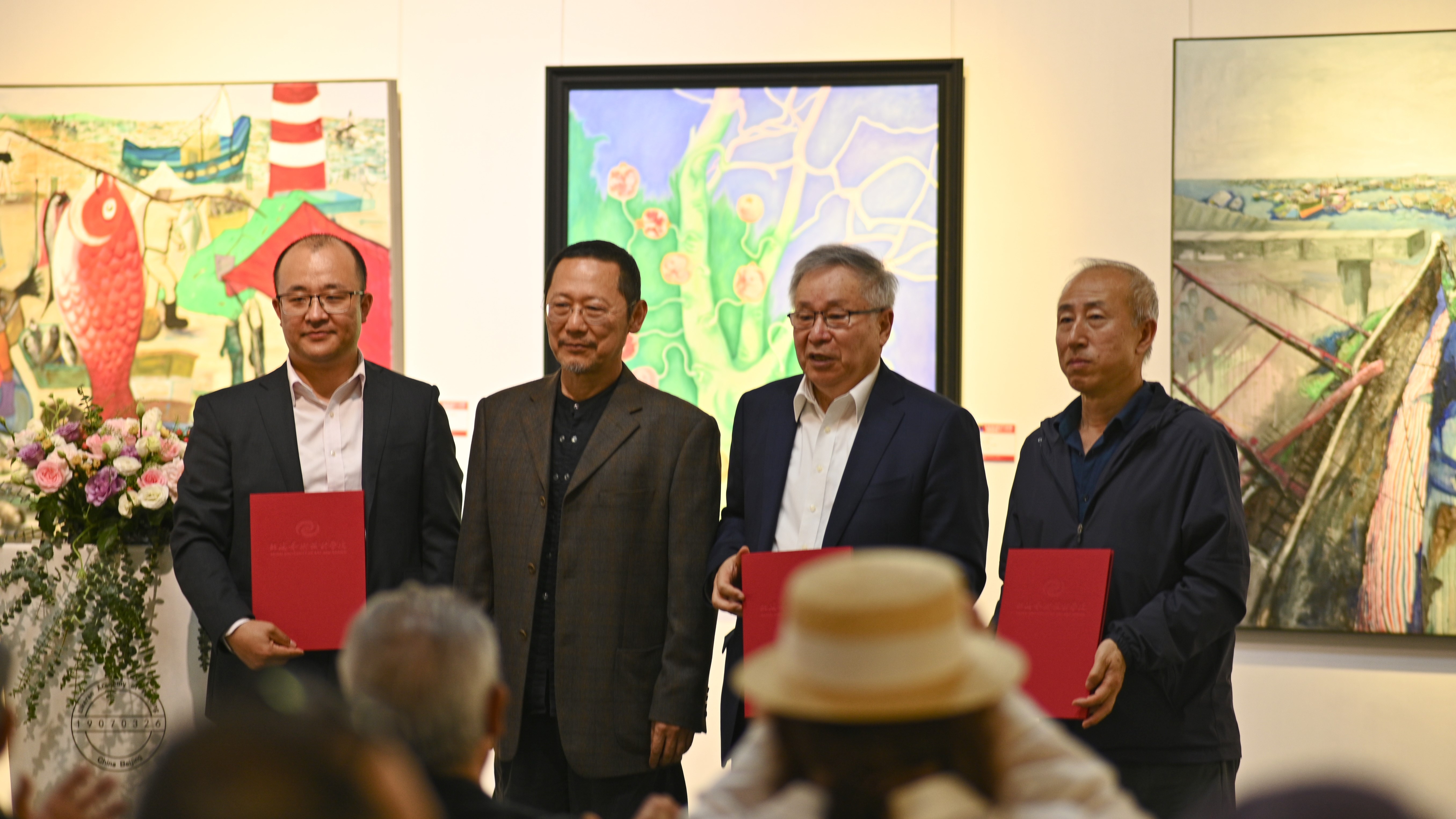 开幕式的最后,李可染画院李庚院长宣布展览正式开幕,并在现场由美术学院刘斌院长代表学校向李可染画院的三位专家学者颁发名誉教授称号。