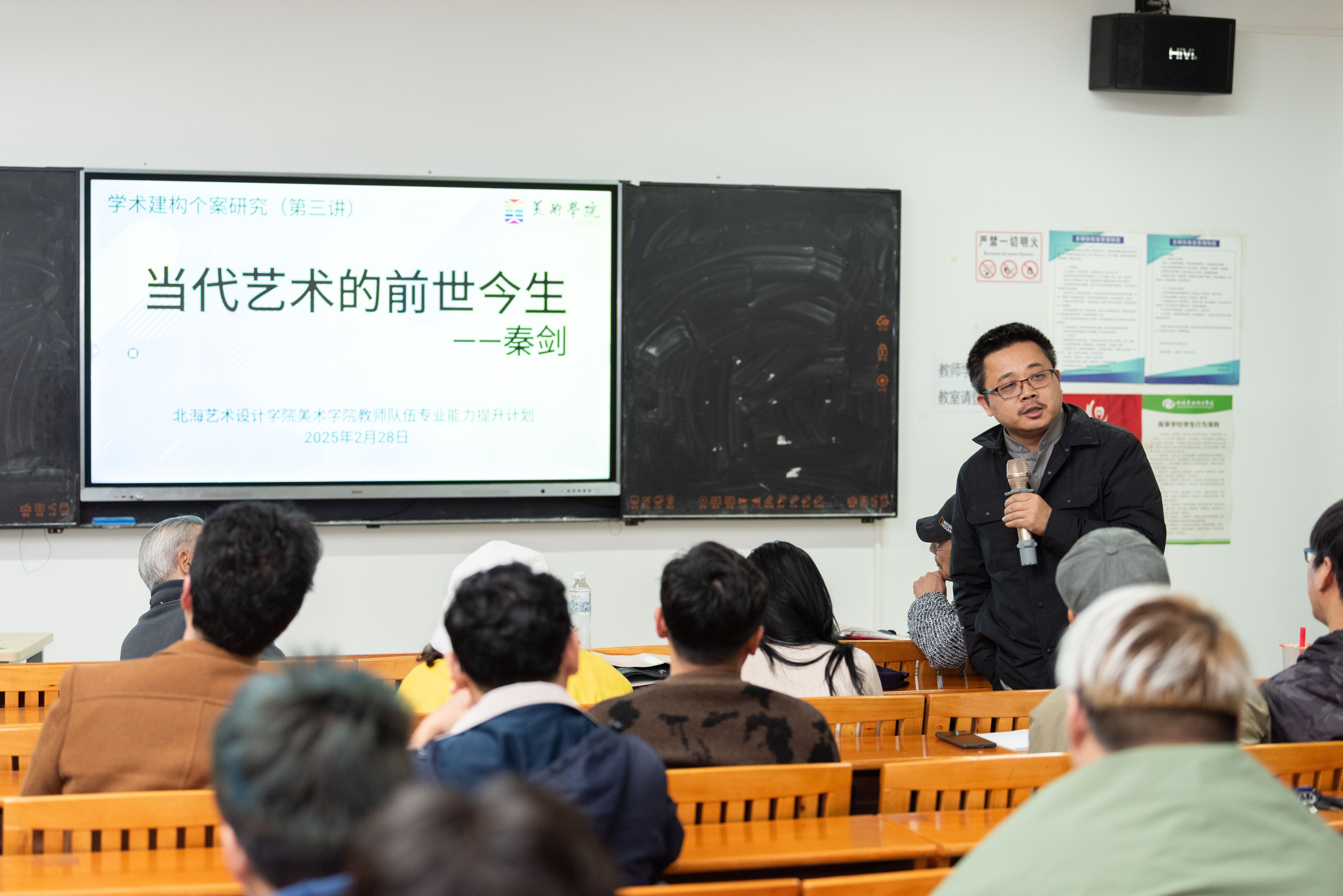228日,美术学院在艺术楼314教室成功举办了教师队伍专业能力提升计划系列活动的第三讲。本次讲座以当代艺术的前世今生为主题,由美术学院外聘教授,原广西师范大学美术学院油画教研室主任、著名当代艺术家秦剑教授主讲。学院办公室副主任景思晔主持本次讲座,出席人员包括美术学院院长刘斌教授、执行院长龚为教授、副院长金凯婧、副院长陈建江、雕塑专业学科带头人王少军教授以及雕塑、绘画、美术学专业的专任教师。