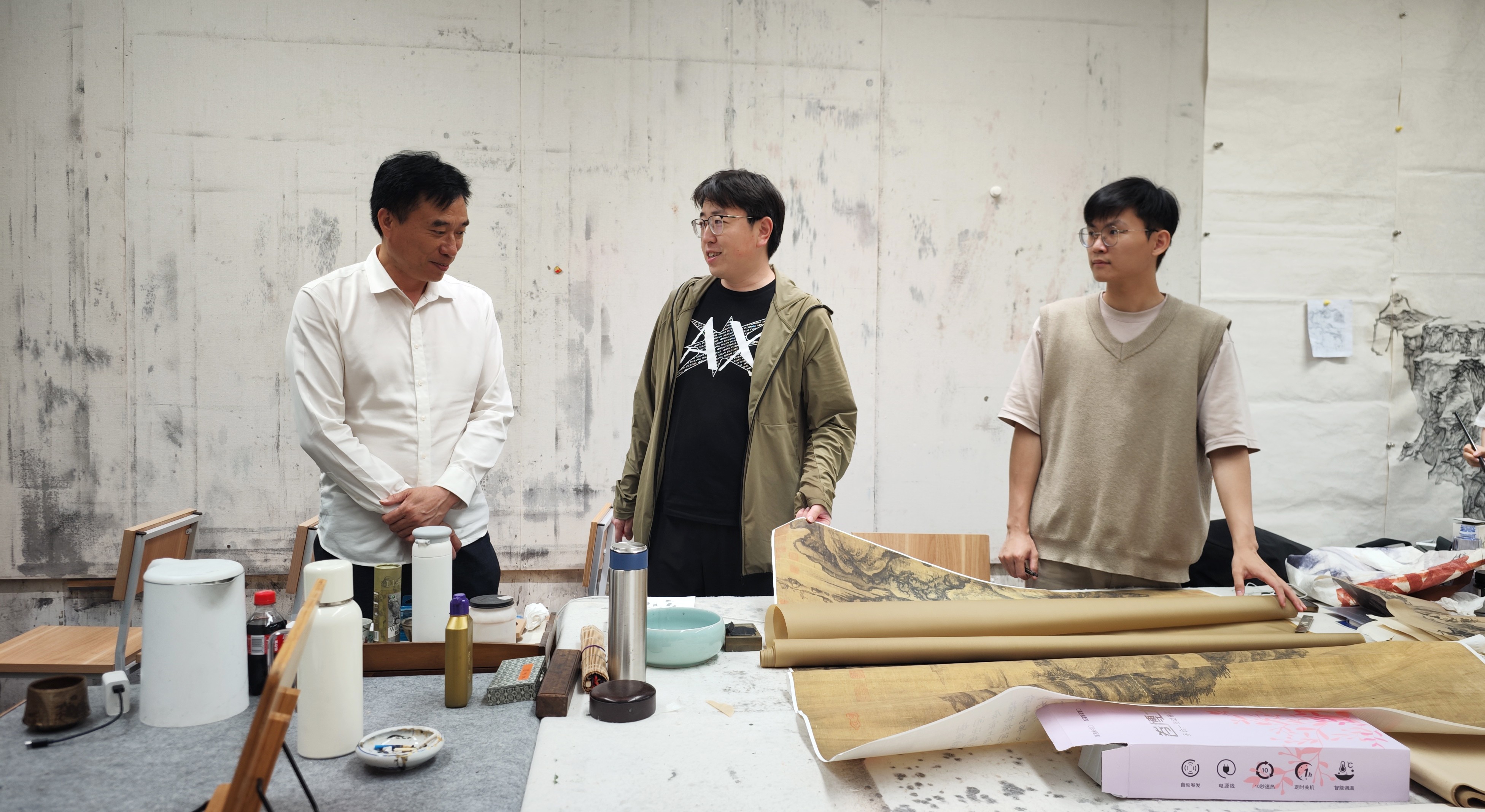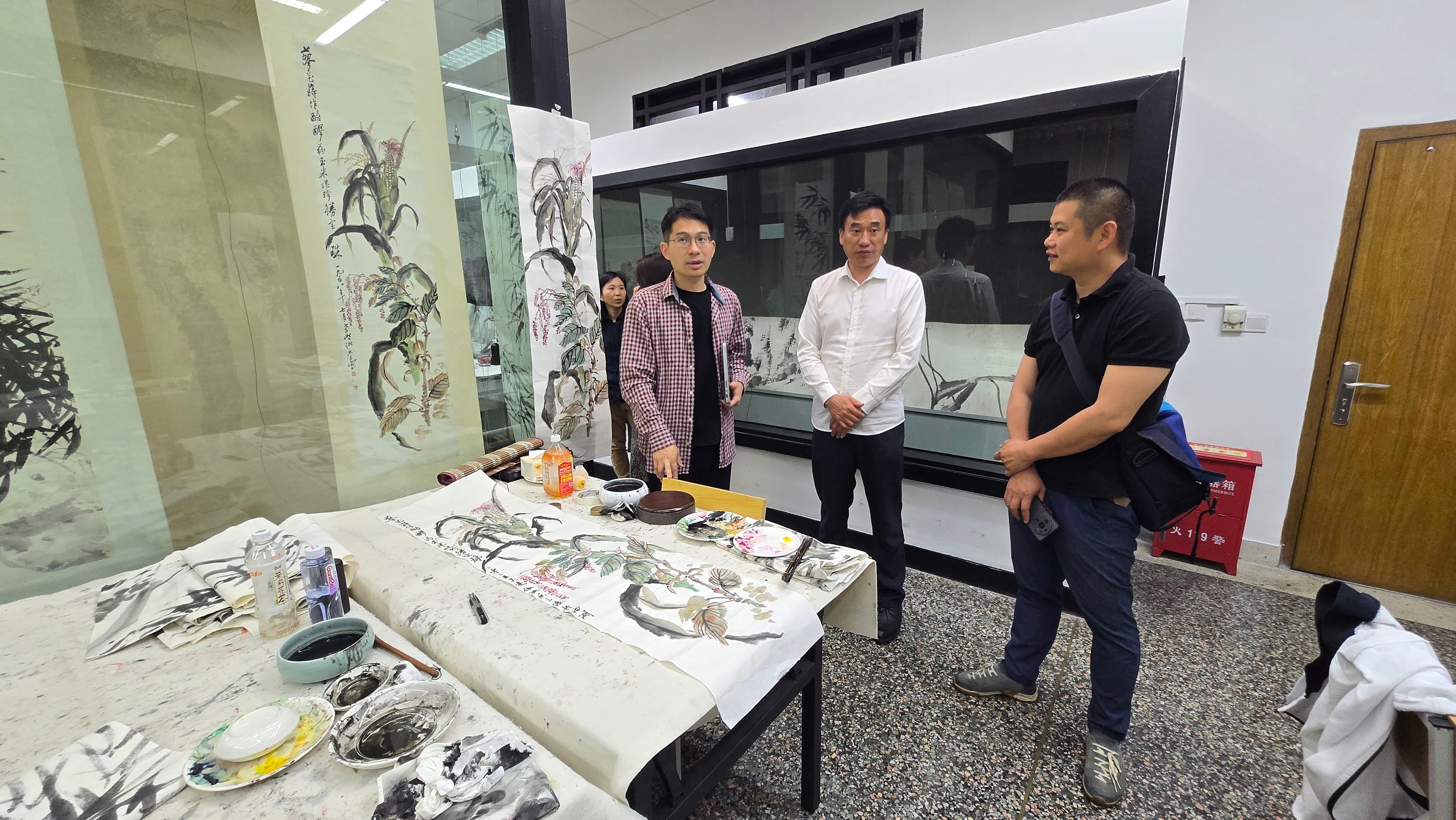 图为中国美术学院中国画学院山水教研室范阳子教师(左二)向陶校长介绍台湾学生创作材料
