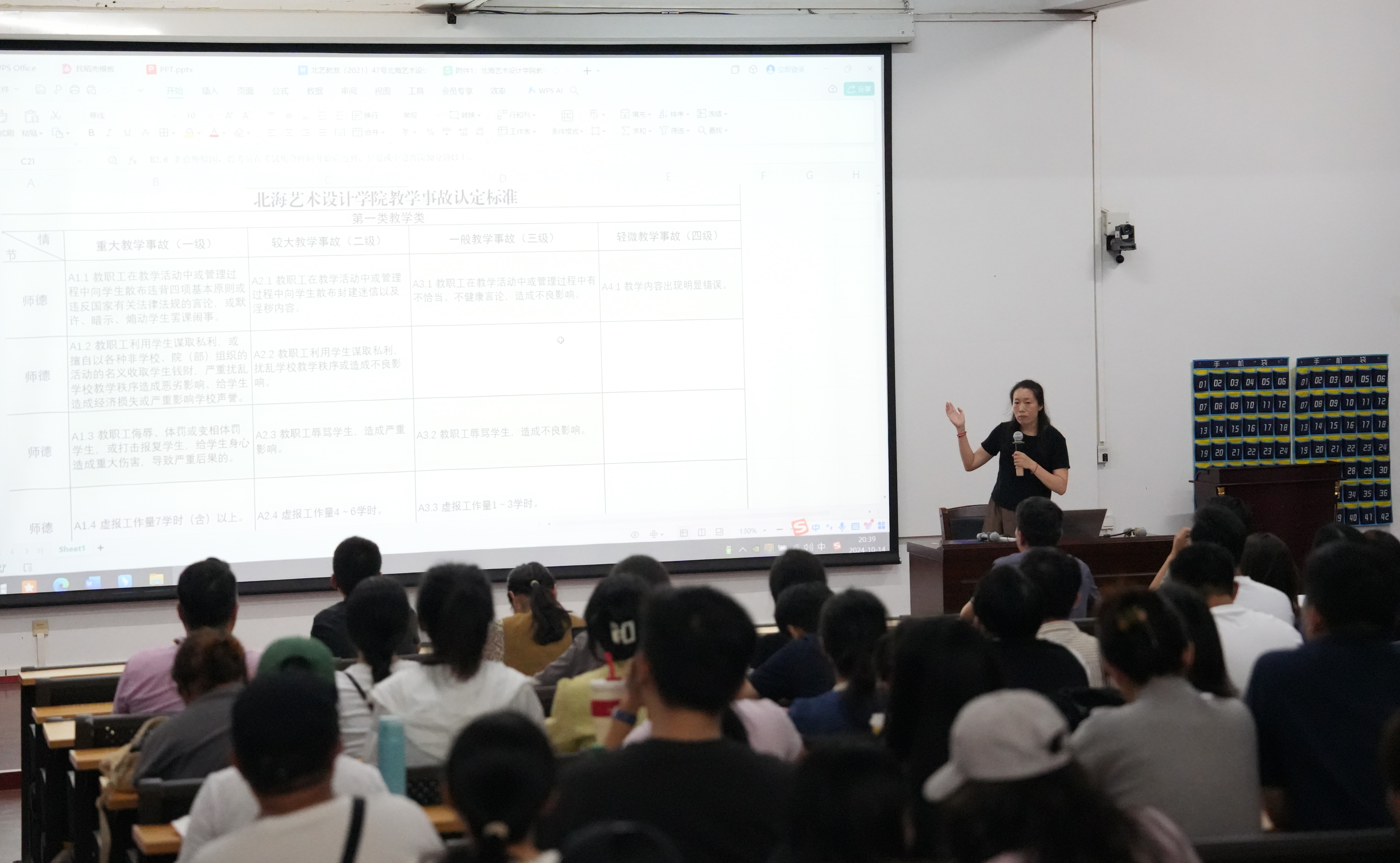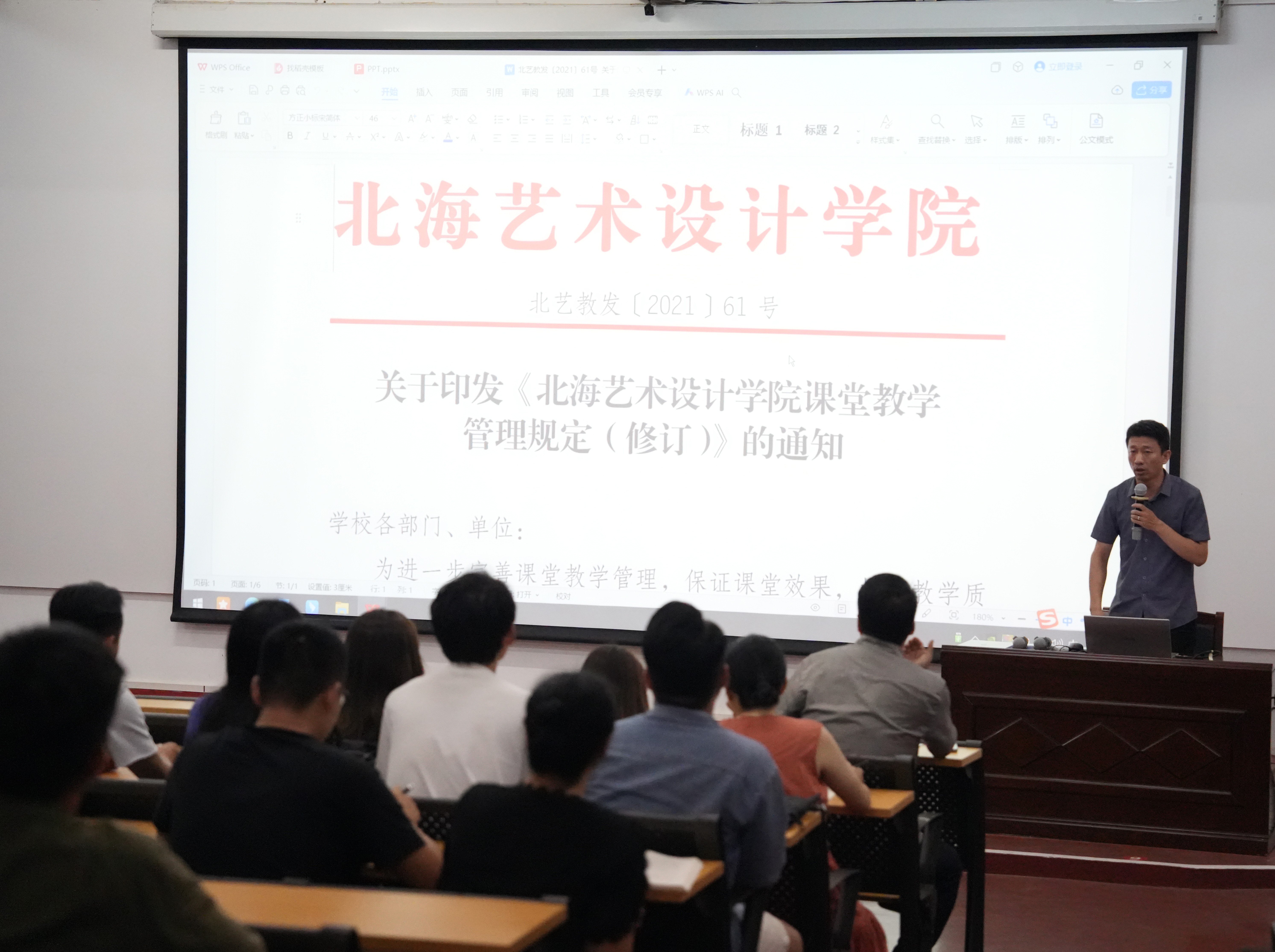 白建强副院长就北海艺术设计学院的课堂教学管理规定和教学工作规程进行了讲解。同时,介绍了科研诚信建设学习教育宣传月活动的学习内容。