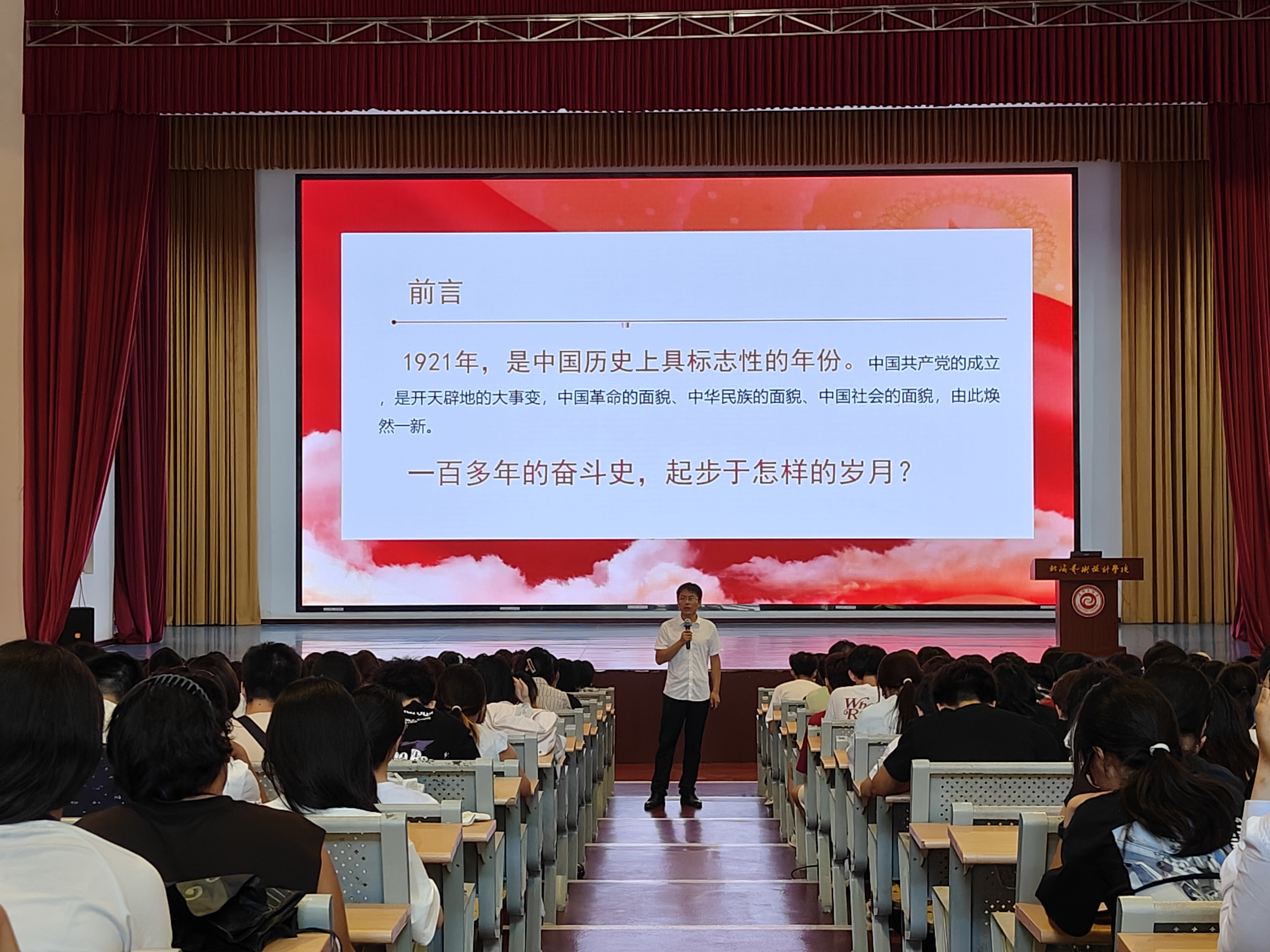 讲座以“历史启迪未来”为核心,系统梳理中国共产党百年奋斗历程中的关键节点。从1919年五四运动点燃反帝反封建的火种,到1921年中国共产党成立开启历史新纪元;从井冈山会师、长征胜利的艰苦求索,到抗日战争、抗美援朝的浴血荣光;从新中国成立、“一五”计划奠定工业基础,到“两弹一星”彰显科技实力;从十一届三中全会开启改革开放,到香港澳门回归、加入世贸组织融入世界;再到2020年全国832个贫困县全部摘帽,直至2025年纪念抗战胜利80周年,一段段厚重历史通过图文并茂的形式呈现,让新生深刻感悟党的初心使命与奋斗精神。
