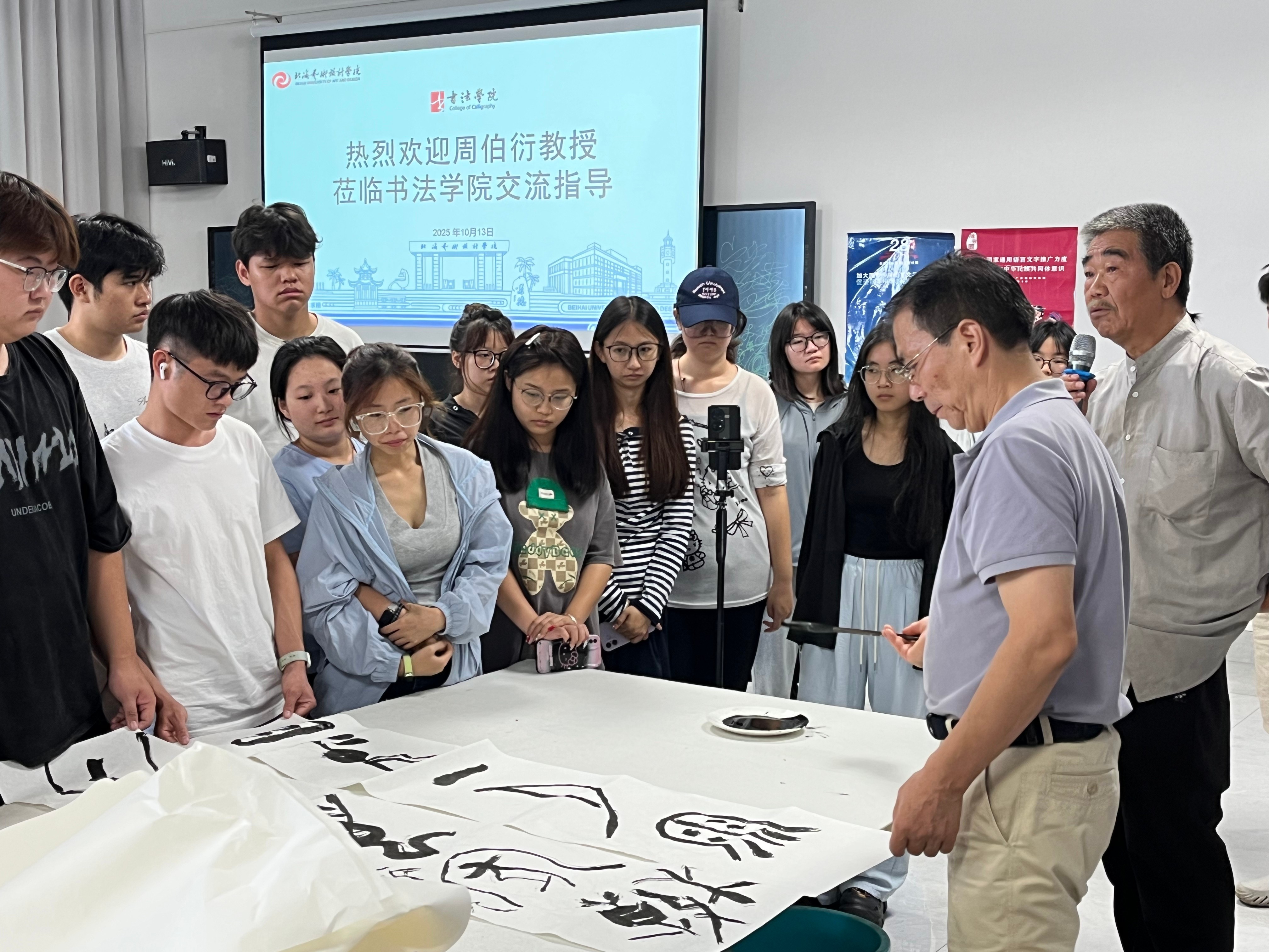 在笔会环节中,周伯衍主席在现场挥毫泼墨,展示了甲骨文书法的创作过程,为学生们阐释了甲骨文创作在用笔、字法、章法方面的特点。通过现场观摩教学,学生们在研习甲骨文形质之美的同时,更体悟到其笔法流转间的历史神采。