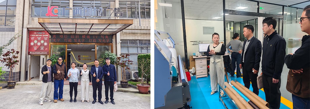 在广西御城广告策划有限公司,专项调研组实地参观了企业的创意设计工作室、广告制作加工基地,全面了解广告策划、平面设计、品牌视觉打造、项目落地执行的全流程业务模式。校企双方召开人才培养专题座谈会,该企业负责人梁总分享了广告设计行业的发展现状与实战经验,明确了岗位招聘中对学生创意创新能力、实操动手能力和项目沟通能力的核心要求;钟远诚副院长结合专业培养目标,与企业就人才培养方向、实践教学重点、实习实训内容等方面进行精准对接,双方还就共建实习实训基地、联合开展校企合作实践项目等事宜初步达成了合作意向。
