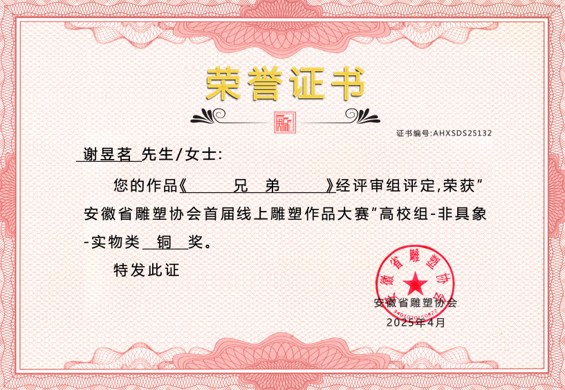 2025 年4月 作品《兄弟》获“安徽省雕塑协会首届线上雕塑作品大赛高校组-非具象-实物类”铜奖;
