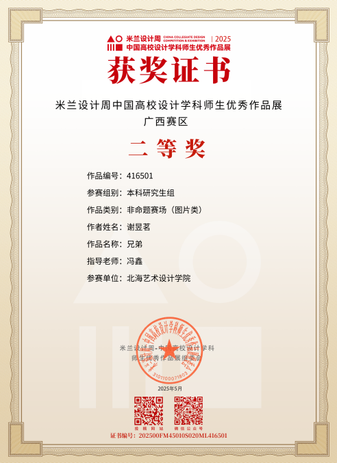 2025年5月 作品《兄弟》获米兰设计周中国高校设计学科师生优秀作品展广西赛区二等奖。
