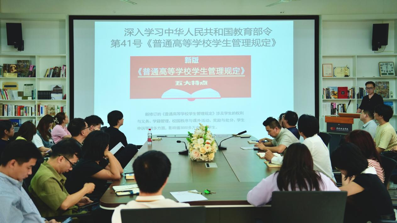 随后,全体教职工重点研读《教育部关于全面推进健康学校建设的指导意见》及中华人民共和国教育部令第41号《普通高等学校学生管理规定》。张帆书记逐一对两项文件进行深入解读。他指出,健康学校建设指导意见从总体要求、重点任务、主要举措、组织保障、参考标准五个维度系统部署,核心是全面贯彻党的教育方针、落实立德树人根本任务,坚持五育并举、践行“健康第一”教育理念,学院需结合动画专业教学特点,将健康理念融入课程设计、实践教学与校园文化建设全过程;针对《普通高等学校学生管理规定》,他强调,该规定是新时期高校学生管理工作的根本遵循与重要依据,全院教职工要深刻领会其科学内涵与核心要求,进一步提升学生管理工作规范化、精细化水平,在维护校园安全稳定、加强校园文化建设、关注学生思想动态等方面创新举措,全力开创学生管理工作新局面,为学院事业高质量跨越发展筑牢坚实基础。