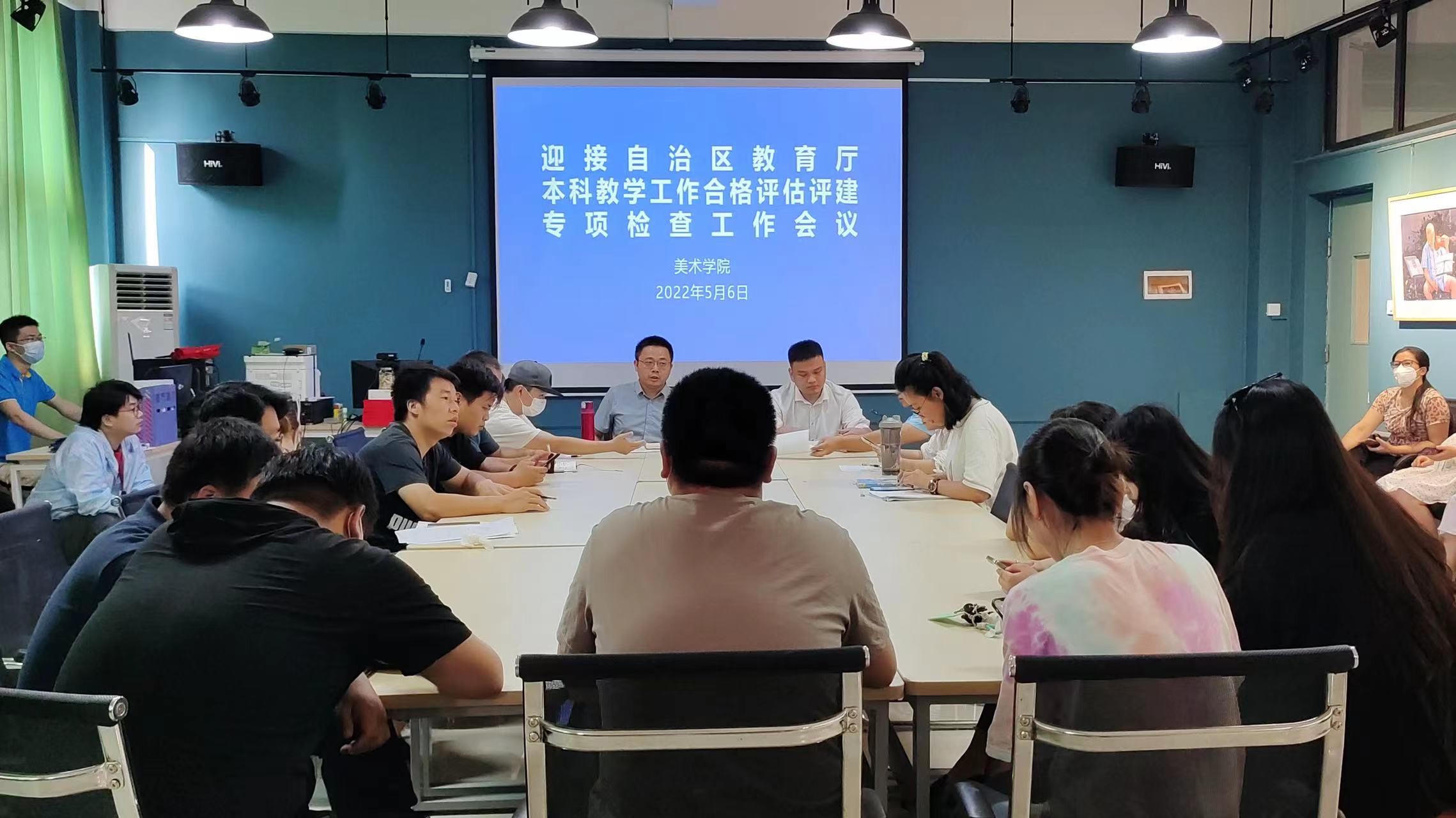 2022年5月6日下午5时,美术学院全体教职工于艺术楼313参与了有关迎接自治区教育厅本科教学工作合格评估评建专项检查工作的会议。