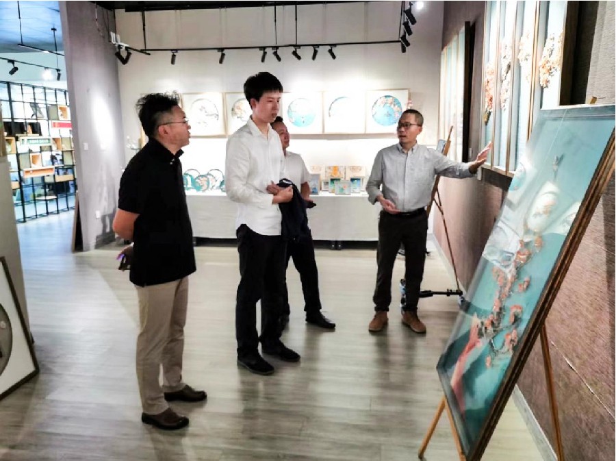 2022年119日,北海艺术设计学院董事长郑念贻副校长邱杰等一行4人,赴北海喜蛙家居设计有限责任公司进行考察。考察期间,喜蛙公司总经理何明军带领北海艺术设计学院一行参观贝雕文化馆和贝雕制作的工作车间。何经理生动地介绍了贝雕文化馆中极具观赏和收藏价值的作品《香远同时详细解说了贝雕与钟表、灯具结合的创新型产品与贝雕制作的工艺流程。