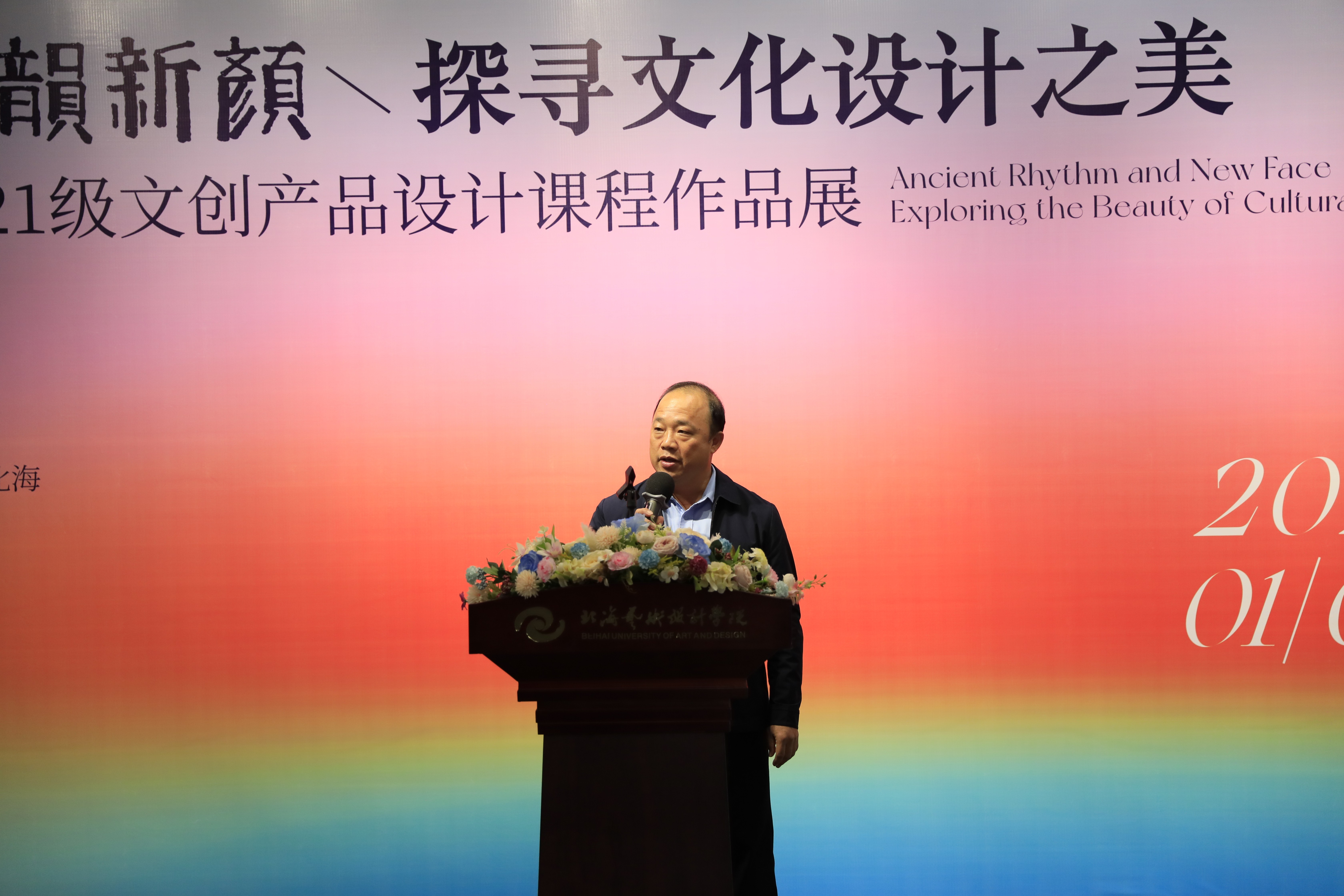 1月5日上午,设计艺术学院视觉传达设计专业2021级“古韵新颜——探寻文化设计之美”文创产品设计课程作品展在学校南校区艺德楼8楼北侧展厅拉开帷幕。学校党委书记范徽忠、副校长陶立阳出席开幕式,教学质量监控与评估中心主任孙竹青,马克思主义学院院长姜献生,创新创业学院院长云曼,设计艺术学院院长李林平,副院长白建强、李佩,合浦汉代文化博物馆馆长廉世明,北海远见传媒集团副总经理王斌、廖艺艺,人事部经理郭艳娟;设计艺术学院任丽凤、傅颖哲、王善民、龚东庆等教授及任课教师、2021级学生参加活动,开幕式由视觉传达设计教师石宏伟主持。