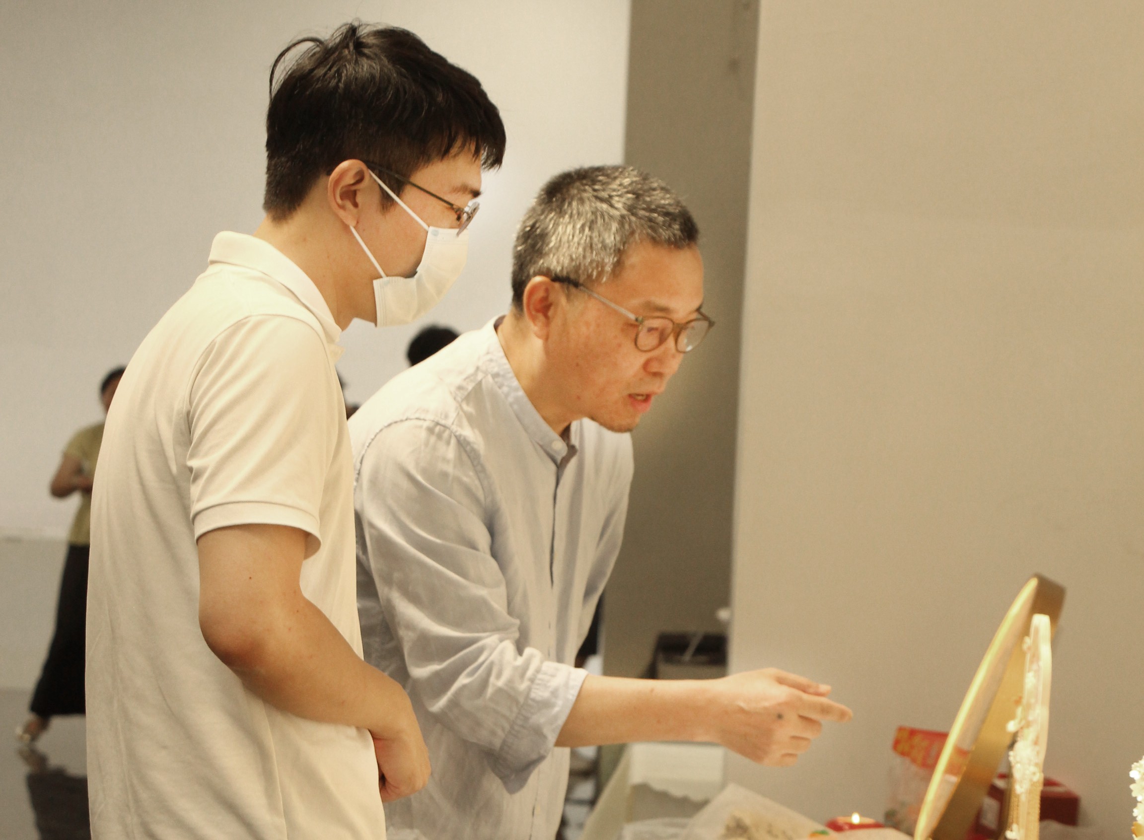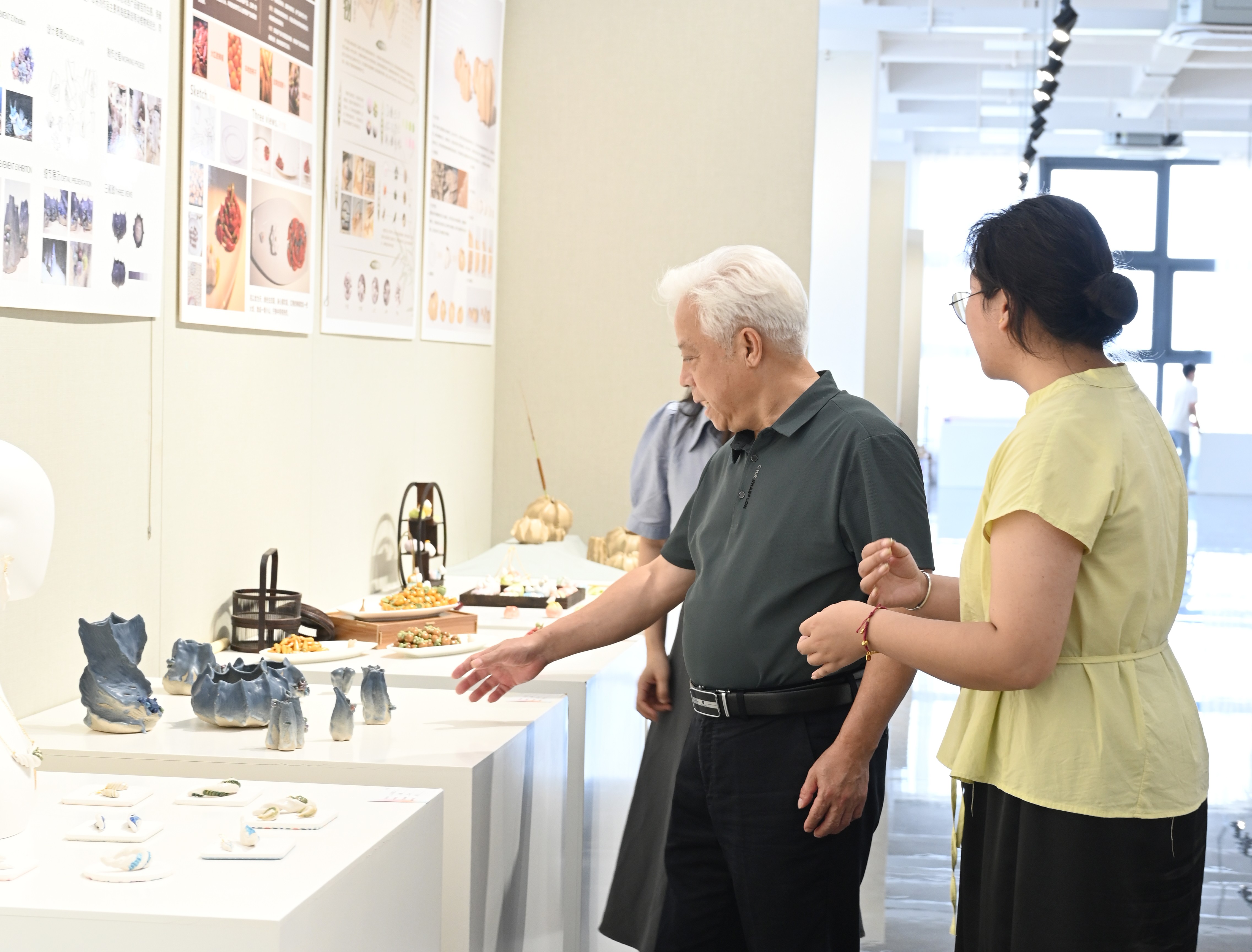 中国工艺美术大师利成世(右二)、北京工业大学贾荣建教(右一)授参观展览。