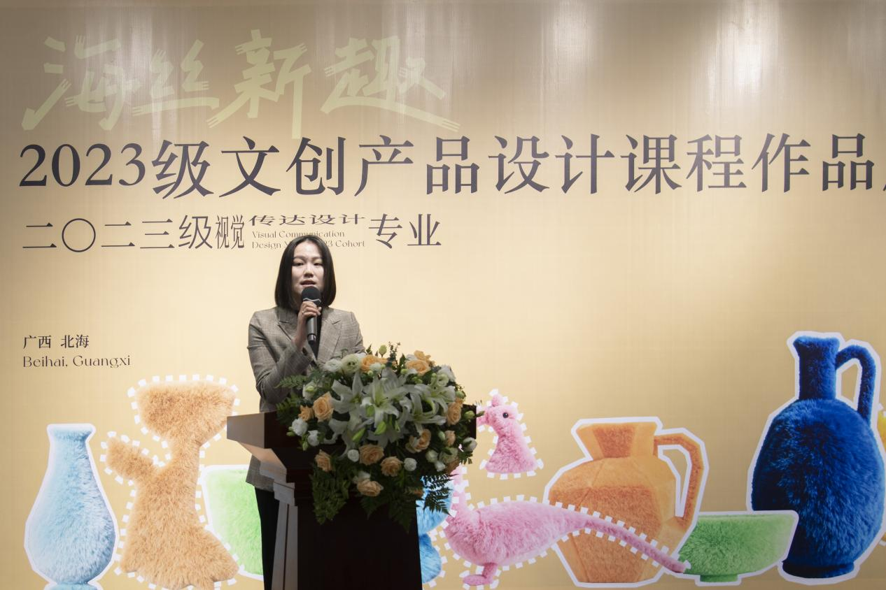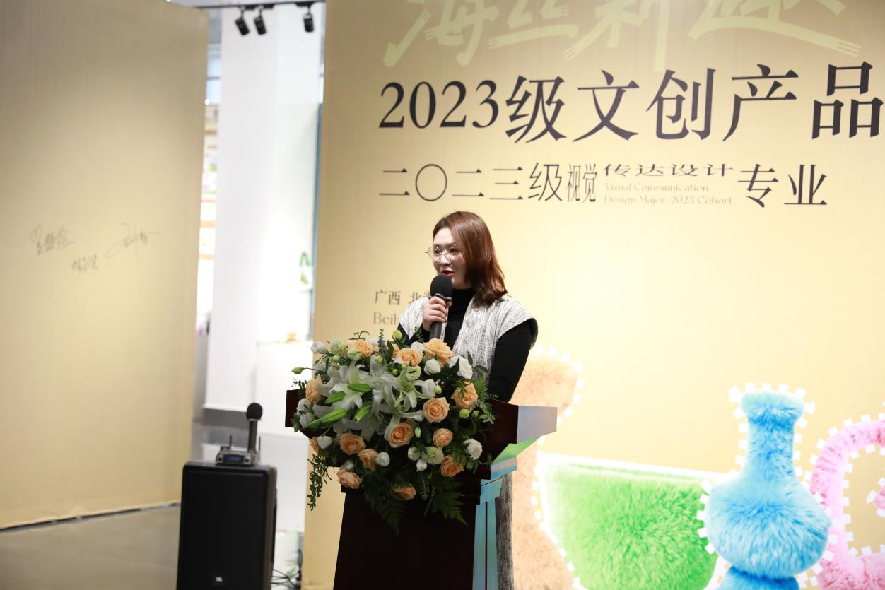 吴慧霞副院长为本次展览致词,她指出,文创产品设计课程是学院推动“文化+设计+科技”深度融合的重要载体,始终贯彻“以文化人、以美育人”的教学理念,致力于在文化感知、创意转化、市场链接中实现育人模式的系统升级。她强调,此次展览不仅是课程教学成果的展示,更是学院“馆—校—企”协同育人机制和“承—创—传”进阶式培养路径的具体实践。