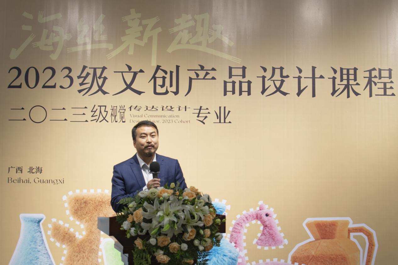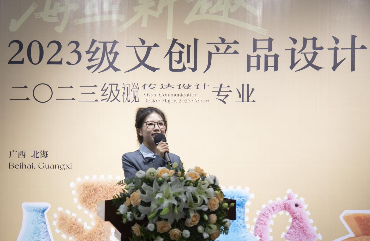 课程教师代表刘馨回顾了课程从选修课发展为校级一流课程及课程思政示范课的历程。她指出,依托“馆—校—企”协同育人平台,课程不断强化教学内容的实践性与前瞻性,推动学生作品从概念构思走向产品落地,部分成果已实现IP转化并投入市场,充分体现了“教、学、做、创”一体化的育人成效。