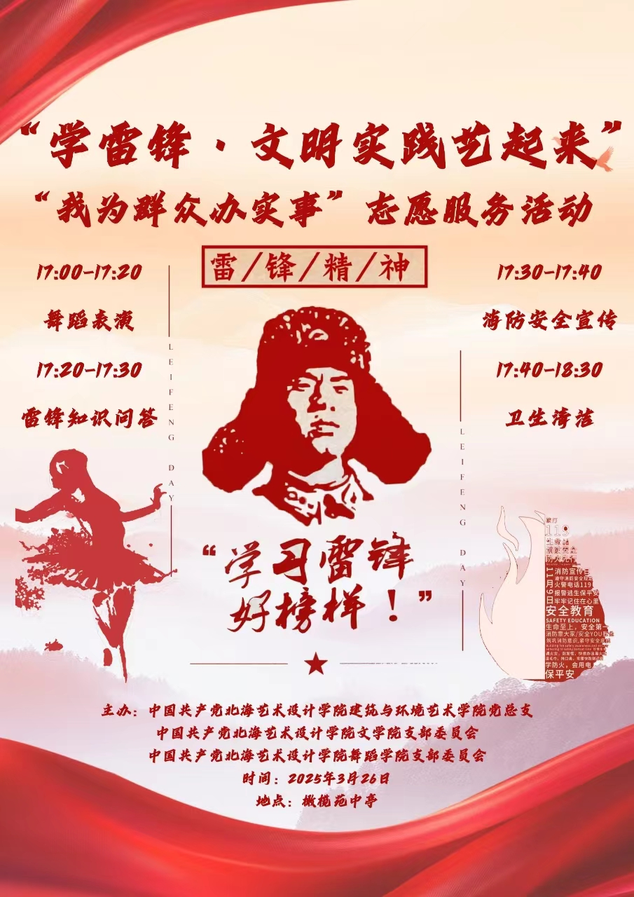3 月 26 日下午 5 点,文学院党支部、建筑与环境艺术学院党总支与舞蹈学院党支部走进橄榄苑社区共同举办了一场旨在弘扬雷锋精神,践行文明理念“学雷锋・文明实践艺起来”志愿服务活动此次活动吸引了社区居民的热情参与,在小区内营造出浓厚的志愿服务氛围。