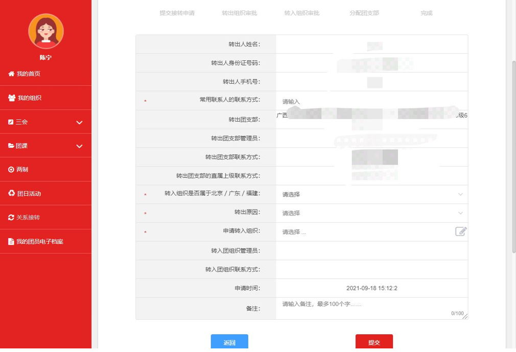 4.按照界面要求和提示填写完成后,检查确认信息是否填写无误,点击“提交”,等待转出组织与转入组织审核同意就完成咯~