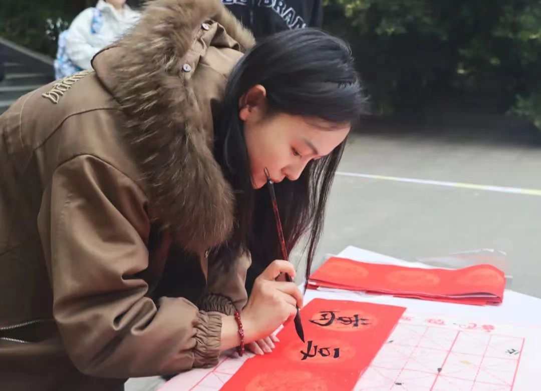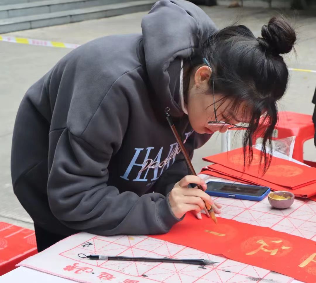 志愿者一起挥毫泼墨,用或丰实厚重,或飘逸潇洒的笔触,满怀热情地写下一幅幅饱含美好祝福的春联。正所谓无联不成春,有联春更浓,他们挥毫笔墨、走笔游龙,笔尖点缀着人间烟火气息,赢得在场学生阵阵赞誉。“爆竹四起接五福,梅花一枝报三春”、“福如旭日腾云起,财似春潮乘风来”、“国泰民安逢盛世,风调雨顺颂华年”一幅幅春联里都承载着新春最诚挚的祝福。