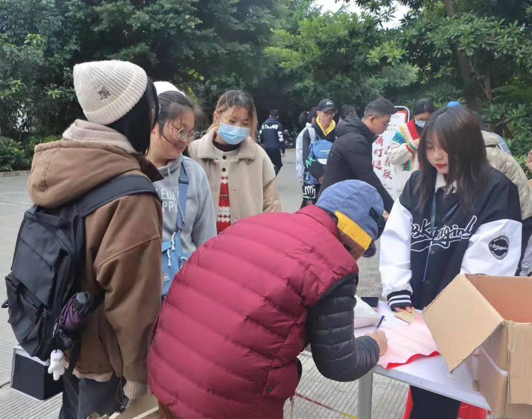 同学们耐心排队等待定制的对联,志愿者们按照同学们要求认真书写春联,工作人员认真核实同学登记的信息之后,将春联赠予本人。