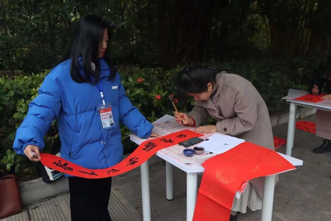 本次活动是由招募的志愿者人员进行现场书写春联,在寒风凛冽中每位志愿者紧握手中灼热的笔杆书写出对美好未来的憧憬与期盼。