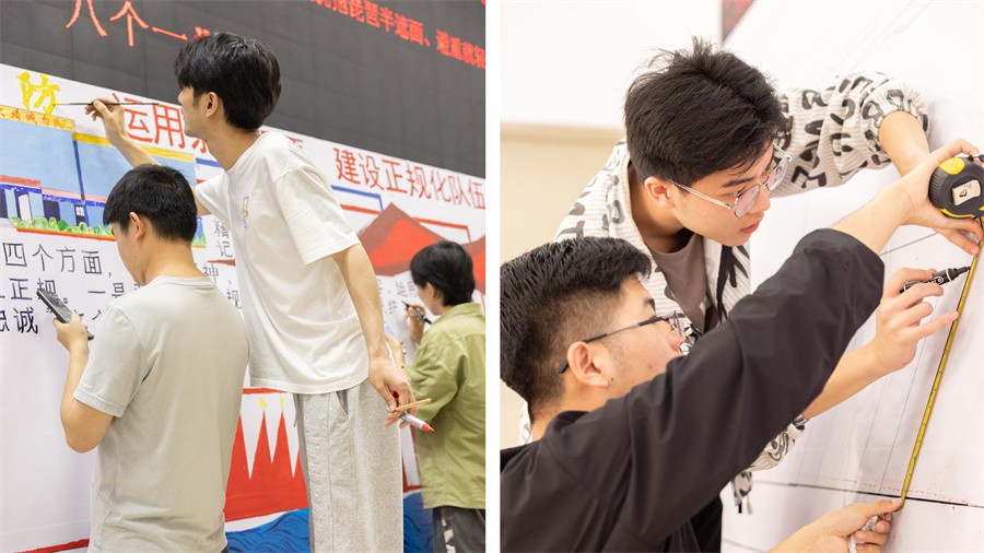 美术学院师生团队以深入学习党的二十大精神、习近平总书记重要训词精神以及“四句话十六方针”为主要内容,精心规划板报整体设计,师生团队分工合作精心绘制,充分发挥专业的优势做好此次社会服务活动。
