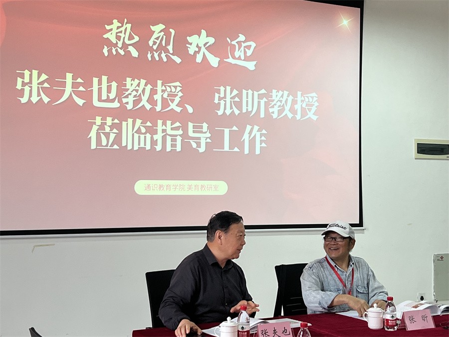 为了深入贯彻中共中央办公厅、国务院办公厅《关于全面加强和改进新时代学校美育工作的意见》,教育部《高等学校公共艺术课程指导纲要》,进一步完善我校美育课程体系建设,丰富美育课程内容,近日,通识教育学院美育教研室在图书馆508会议室召开新时代美育课程改革专家座谈会。清华大学美术学院教授、博士研究生导师、设计艺术学院名誉院长张夫也教授,湖北美术学院教授、硕士研究生导师、设计艺术学院外聘教授张昕教授莅临讲座指导。美育教研室全体教师参加座谈会。座谈会由我校“大美育”教学团队带头人刘静静老师主持。