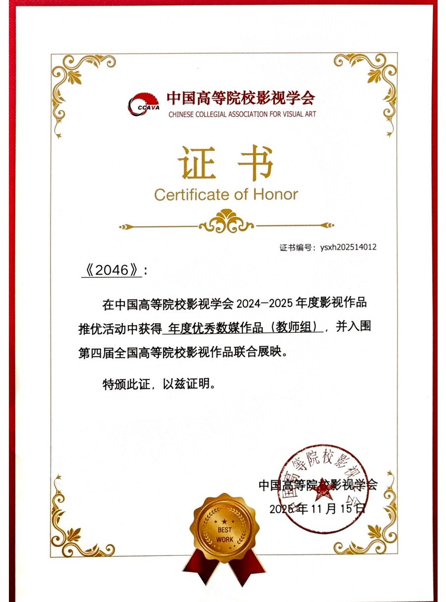此外,教师陈蔓延的AI作品《2046》凭借独特的创作视角、扎实的艺术表达与深刻的主题内涵,成功入围第四届全国高校影视作品联合展映。本次展映汇聚全国高校优质影视创作成果,竞争激烈。作品的入围既展现了我校教师在影视创作领域的专业功底与创新思维,也彰显了影视动画学院在影视创作实践方面的实际成效。