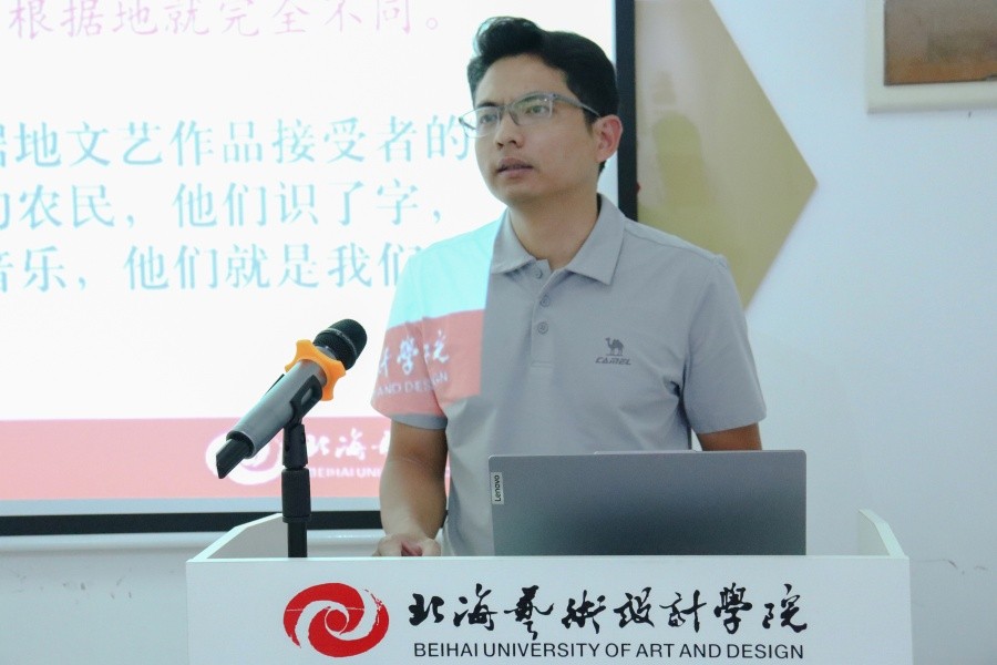 结合我校艺术设计类高校的办学特色,唐道明副教授通过典型案例图片与视频资料,提出艺术创作要坚守人民立场,坚决抵制不良创作倾向,始终扎根人民、扎根生活实践;文艺教育要牢牢把握立德树人根本任务,纠正“重技轻德”倾向,做有信仰、有情怀、有担当的德艺双馨文艺工作者。