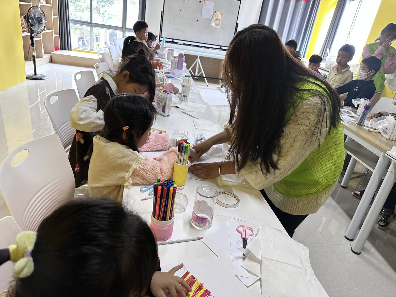 除了绘画支教,志愿者们还进行了手工支教。以手造物,以物寄情。志愿者们指导孩子们先在纸面上画出小老虎,以及小老虎背后的各种小元素。接着他们用剪刀在纸上裁出了形状,粘贴在一个背景板上。充满想象力的小老虎就在孩子们的手工中诞生了!